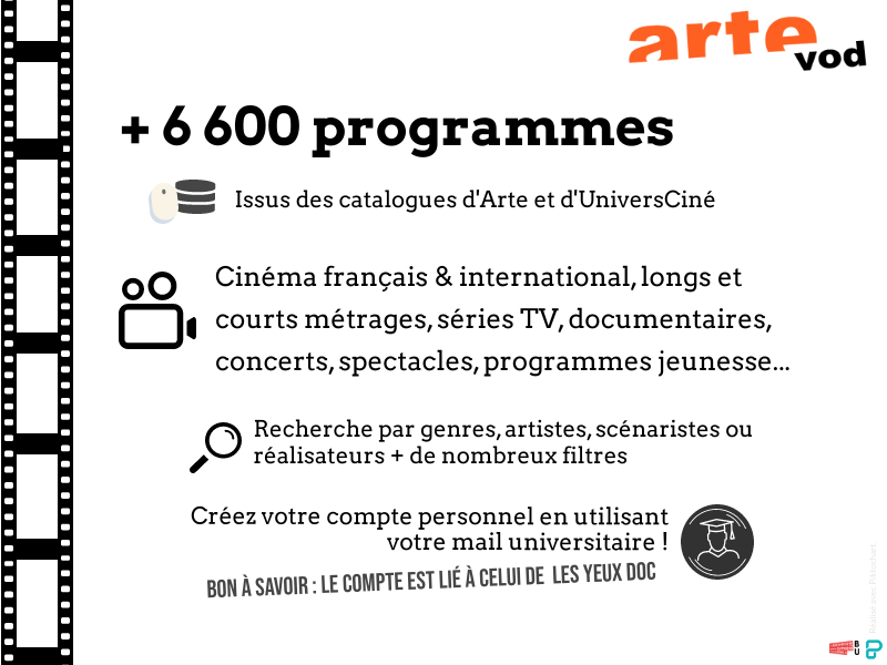 Plateforme proposant 6 600 films issus du catalogue d'ARTE et d'UniversCiné: sélection de cinéma français et international en longs et courts métrages, séries TV, documentaires, concerts.. Découvrez-la par genres, artistes (onglet "catalogue") ou réalisateurs (onglet "Cinetek"). Inscrivez-vous sur la plateforme pour en profiter. Si vous êtes déjà inscrit sur les Yeux doc, vous aurez accès à l'un comme à l'autre service.