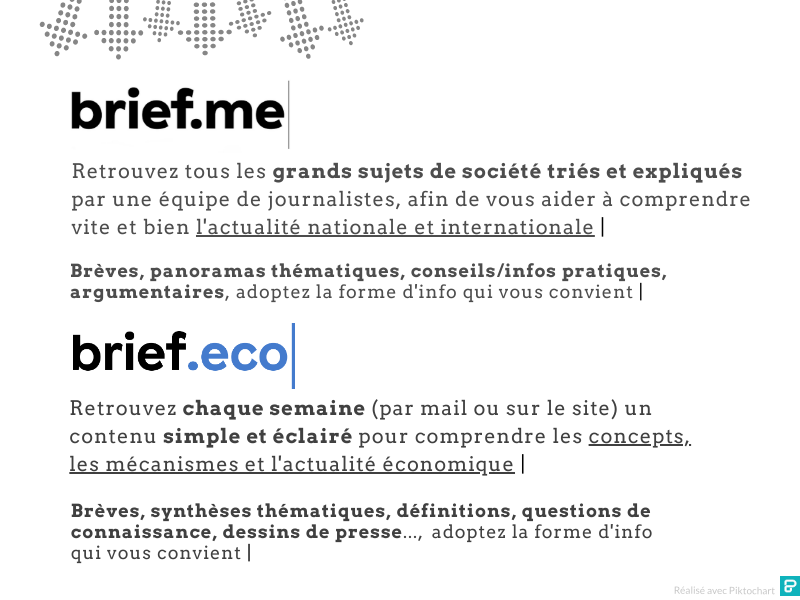 Brief.eco et Brief.me détaillent et expliquent actualité nationale, internationale, économique ou généraliste, par des brèves publiées quotidiennement ou des dossiers de synthèse.