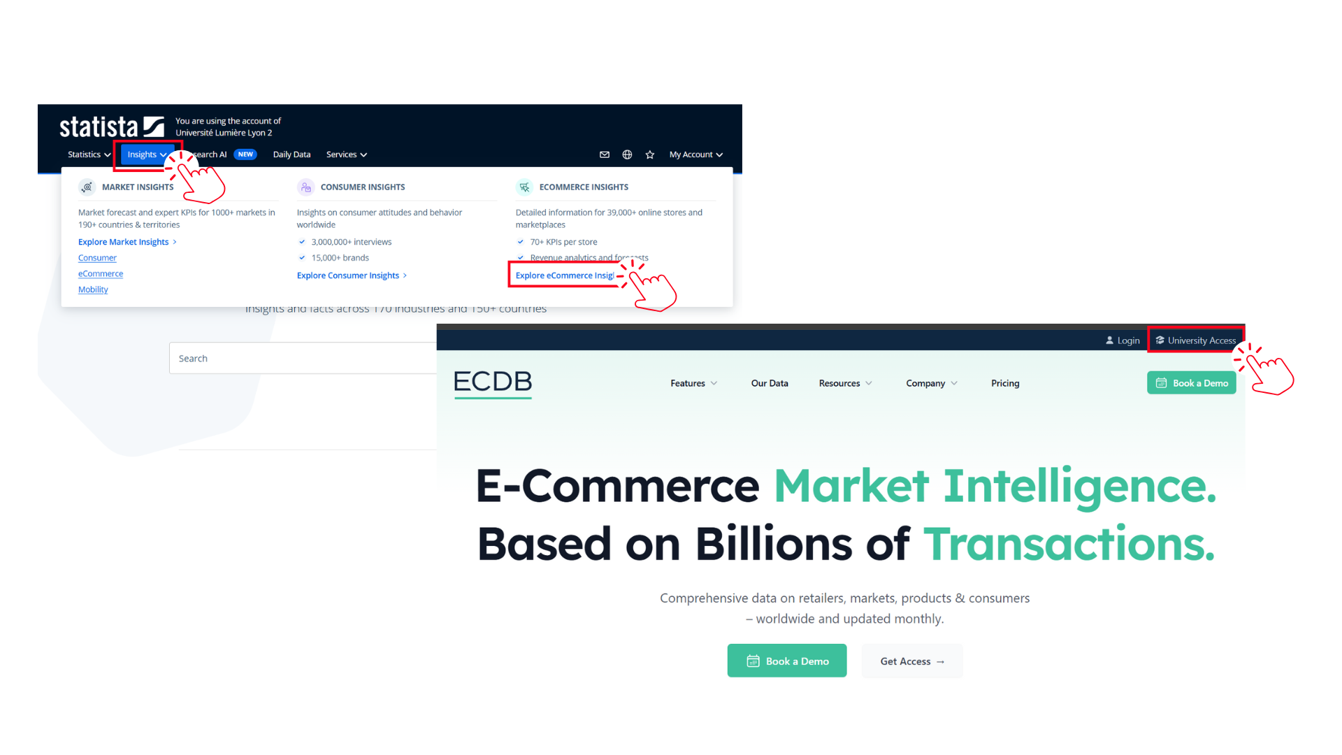Cet outil permet d’analyser des indicateurs clés tels que la valeur moyenne des commandes (AOV), le taux de conversion (CVR), les remises appliquées ou encore les taux de retour, offrant ainsi une vision complète des performances transactionnelles sur l’ensemble des marchés. Ces données facilitent l’identification des zones plus ou moins performantes, ainsi que des schémas comportementaux observés chez les concurrents et dans les différents territoires.Pour accéder à ce module, dépliez l'onglet "Insights", cliquez sur le lien "Explore eCommerce Insights", puis sur "University Access".Rapports et livres blancs