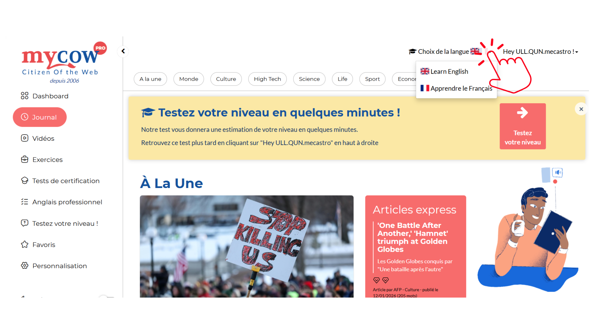 My Cow est une plateforme d'autoformation dédiée à l'apprentissage de l'anglais pour les niveaux A1 à C1 et désormais elle s'adresse aussi aux allophones de niveaux A1 à B2.
