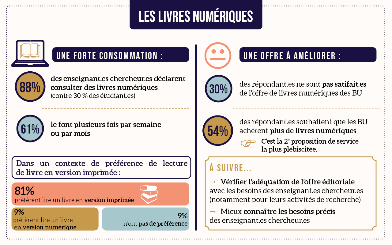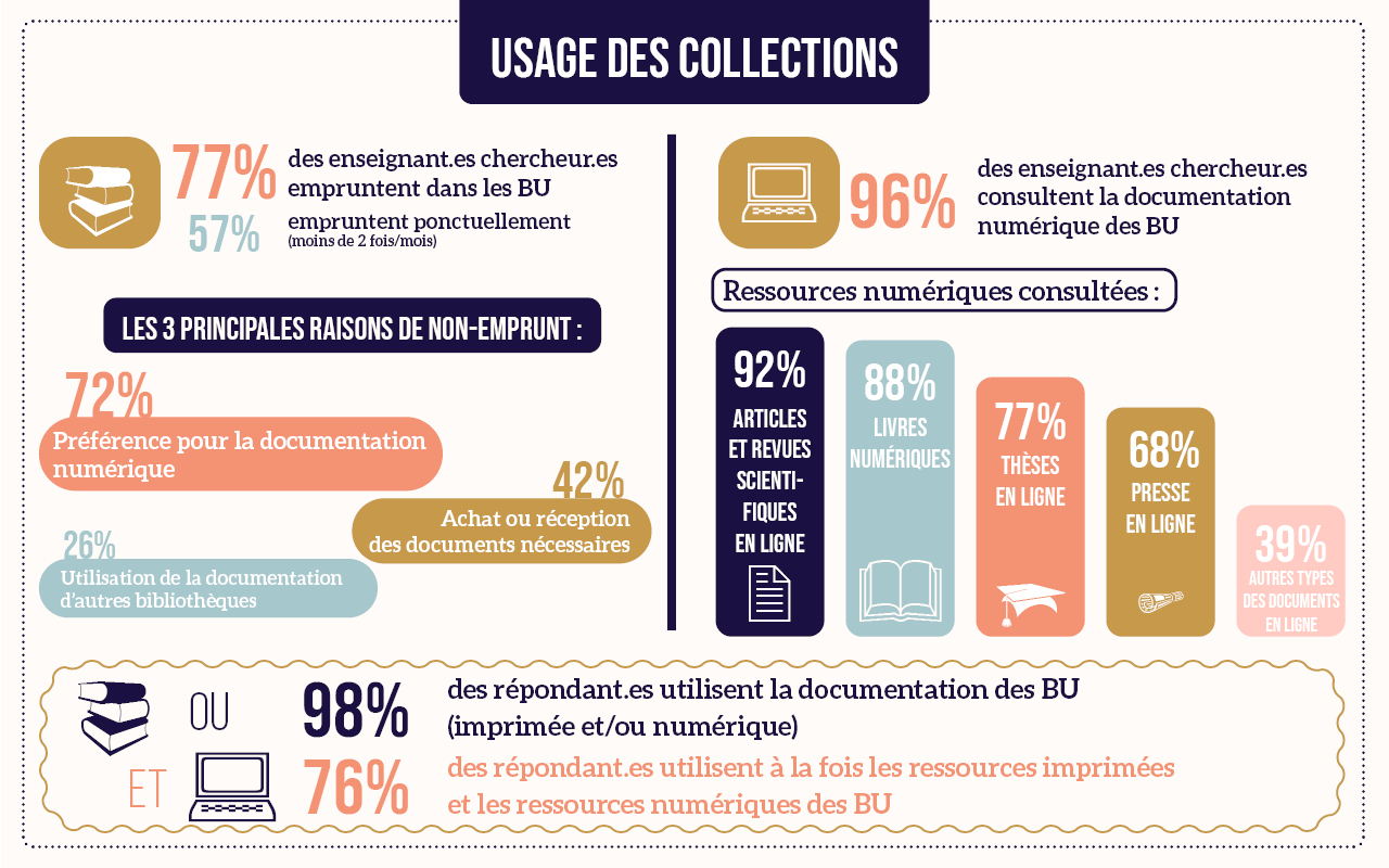Depuis plusieurs années, les collections électroniques se développent dans les BU de Lyon 2, en remplacement ou en complément des collections imprimées. Pour évaluer cette stratégie documentaire et répondre de manière toujours plus adaptée aux besoins des utilisatrices et utilisateurs, le SCD a souhaité réaliser une enquête sur les collections imprimées et électroniques. Cette enquête s'inscrit à la suite de celle réalisée auprès des étudiant.es à l'automne 2019.
